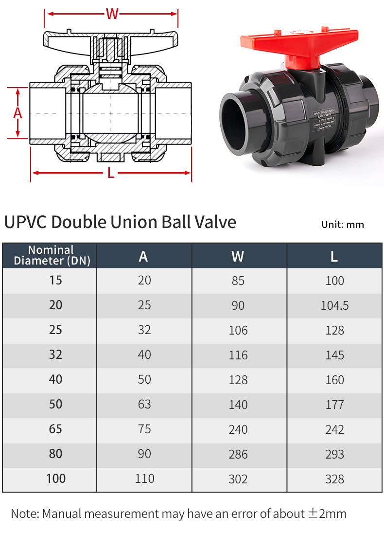 الصمام الكروي المزدوج PVC هو صمام كروي حقيقي من النوع الاتحادي مع معيار ANSI بنهاية المقبس، بحجم من 1/2 بوصة إلى 4 بوصة، يتم تشغيله بواسطة رافعة يدوية.